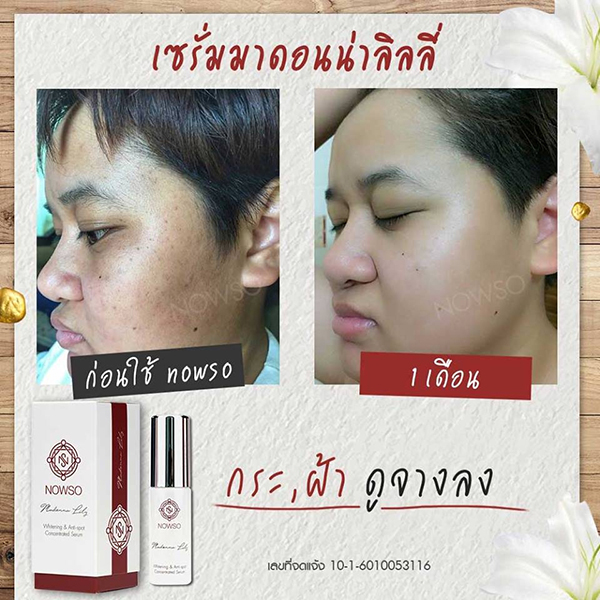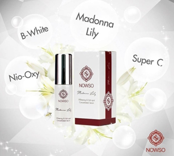 เริ่มกันที่ตัวแม่แห่งวงการบิวตี้แบรนด์ไทยกันเลย หลังจากที่ Nowso ประสบความสำเร็จกับ Golden Horse Oil Facial Cream หรือครีมน้ำนมม้าทองคำไปแล้วเมื่อปีก่อน ปีนี้ขอส่งเซรั่ม Nowso Madonna Lily มาลงสนามความงามบ้าง ความพิเศษของเซรั่มตัวนี้อยู่ตรงที่ใช้สารสกัดดอก มาดอนนาลิลลี่ สีขาวจากจากเทือกเขามองบลังค์ ประเทศฝรั่งเศสซึ่งเป็นแหล่งปลูกลิลลี่ที่ดีที่สุด นอกจากนั้นยังได้รับการการันตีจาก สถาบัน Dermscan Asia ว่าเซรั่มมาดอนน่าลิลลี่มีคุณสมบัติในการช่วยให้ผิวขาวกระจ่างใสได้เร็วเป็นพิเศษ หมดความกังวลสำหรับสาว ๆ ที่ผิวบอบบางแพ้ง่าย เพราะเป็นนวัตกรรมจากธรรมชาติที่อ่อนโยนและปลอดภัย ไม่มีน้ำหอม ไม่มีแอลกอฮอล์ที่ทำร้ายผิว อีกทั้งยังผสานนวัตกรรมใหม่ล่าสุดจากทั้งอิตาลี แคนาดา และญี่ปุ่น ซึ่งยังไม่มีแบรนด์ไหนกล้าให้ขนาดนี้มาก่อน ตอบโจทย์ทั้งเรื่องริ้วรอยลดเลือน รอยดำรอยแดงจากสิวจางลง และบำรุงลึกถึง 3 ชั้นผิว ปรับให้ผิวขาวใสขึ้นจากภายในอย่างเห็นได้ชัด