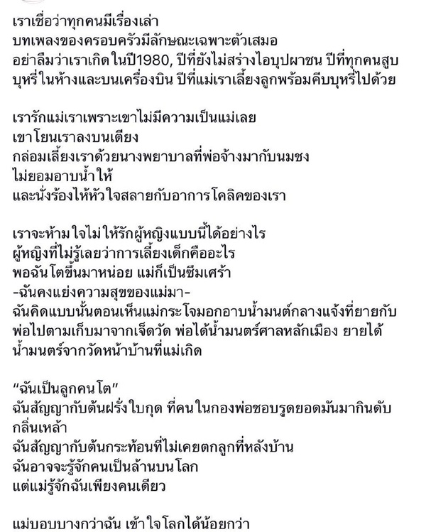 "แม่บอบบางกว่าฉัน เข้าใจโลกได้น้อยกว่า การมีแม่คือการมีลูกวัยรุ่นที่ฉันไม่มีวันหมดห่วง ฉันไม่ได้รักแม่ที่เป็นแม่เป็นแม่ที่ดี ตื่นเช้าไปส่ง นั่งฟังปฐมนิเทศทุกปี