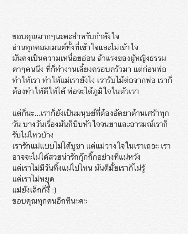 "เราไม่ได้รู้สึกผิดบาปที่เสียใจเรื่องแม่นะ | อย่างน้อยมันก็เตือนให้เราได้รู้ ว่าเราเป็นคนที่แบกทุกเรื่อง ทุกอารมณ์ไม่ไหวหรอก | แต่อารมณ์ก็เป็นคนละอย่างกับหน้าที่ | และเรามั่นใจอย่างยิ่ง ว่า เราไม่เคยบกพร่องในหน้าที่ ไม่ว่าจะในฐานะลูก ฐานะหัวหน้าครอบครัว ฐานะนักแสดง หรืออะไรก็ตาม :))"