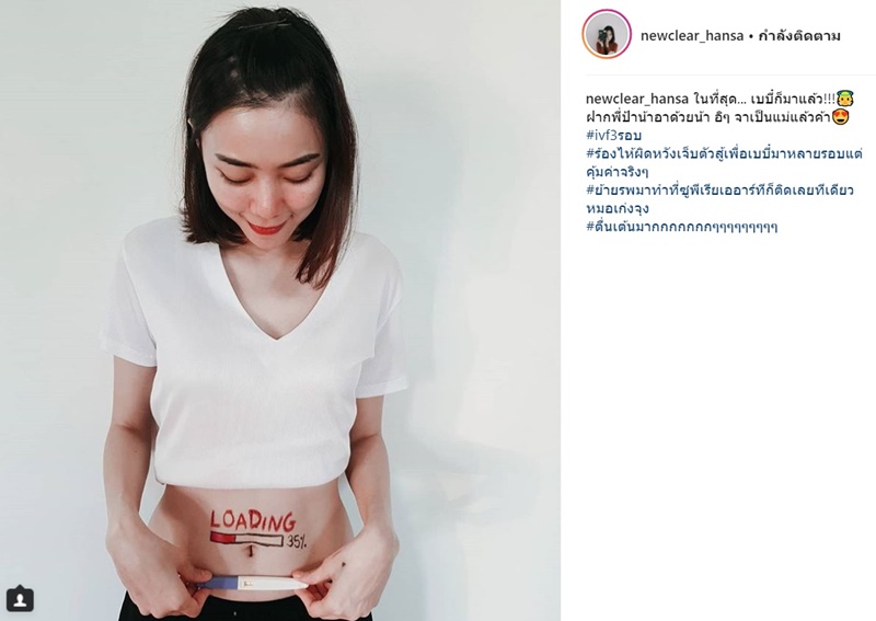 แต่ล่าสุด (10 เมษายน 2561) สาวนิวเคลียร์ ก็ได้ออกมาประกาศข่าวดีว่ากำลังตั้งครรภ์ลูกคนแรกเป็นที่เรียบร้อยแล้ว พร้อมเผยว่า ในที่สุด... เบบี๋ก็มาแล้ว !!! ฝากพี่ป้าน้าอาด้วยน้า อิ ๆ จาเป็นแม่แล้วค้า #ivf3รอบ #ร้องไห้ผิดหวังเจ็บตัวสู้เพื่อเบบี๋มาหลายรอบแต่คุ้มค่าจริง ๆ #ย้าย รพ. มาทำที่ซูพีเรียเออาร์ทีก็ติดเลยทีเดียวหมอเก่งจุง #ตื่นเต้นมากกกกกกก ๆ ๆ ๆ ๆ ๆ ๆ ๆ ๆ ๆ