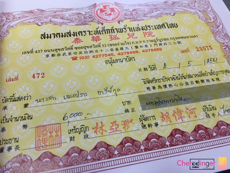 นอกจากนี้แฟนคลับยังได้ร่วมกันทำบุญเลี้ยงอาหารเด็ก ๆ และบริจาคเงิน 6,000 บาท ในนาม เฌอปราง อารีย์กุล เข้าสมาคมสงเคราะห์เด็กกำพร้าแห่งประเทศไทย ขณะที่บางคนได้ทำการบริจาคดวงตา โดยบอกว่านี่คือของขวัญให้เฌอนะ