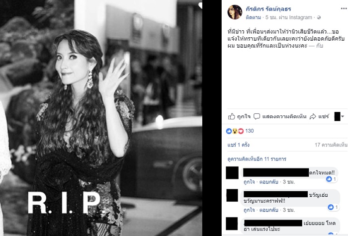 อยู่ดี ๆ ก็เจอข่าวลือเสียชีวิต มีคนทำภาพ R.I.P. ซะอย่างงั้น สำหรับสาว นิว กีรติกร รัตน์กุลธร อดีตนางเอกภาพยนตร์เรื่อง “โบอา งูยักษ์” ซึ่งก่อนหน้านี้เจ้าตัวล้มป่วยเป็นมะเร็งเม็ดเลือดขาว และหลังจากต่อสู้อยู่นานหลายปีในที่สุดเธอก็สามารถพิชิตมะเร็งร้ายได้สำเร็จ
