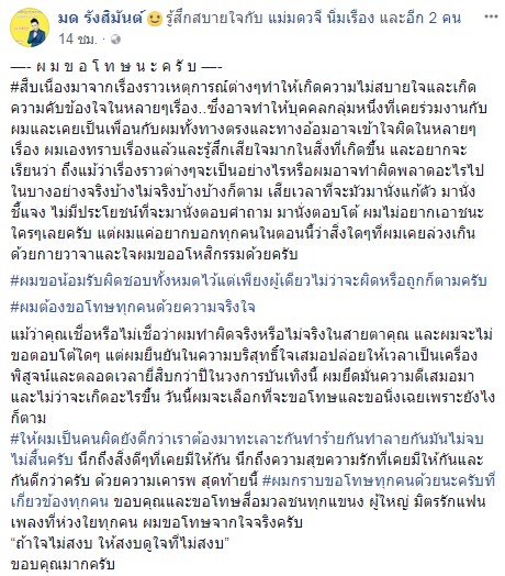 มด รังสิมันต์ ประกาศขอโทษ หลังมีชื่อเข้าข่ายตามโพสต์ของ เอ เชิญยิ้ม เชื่ออาจเกิดความเข้าใจผิดกัน แต่ขออโหสิกรรม พร้อมน้อมรับผิดทุกอย่าง
