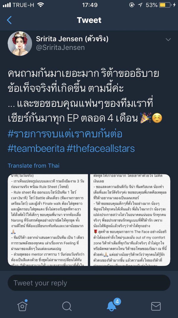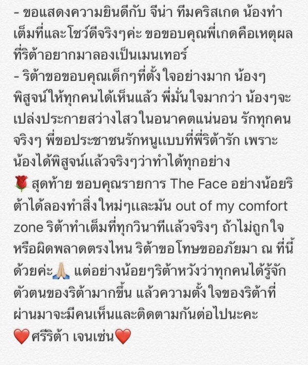 ศรีริต้า เจนเซ่น ขอชี้แจงปมโชว์ Final Walk เวที The Face Thailand Season 4 All Stars ลูกทีมตกรอบมีโชว์เปลี่ยนชุด-เมนเทอร์ใส่ชุดสีขาว แย่งซีนคนที่ผ่านเข้ารอบ เผยทุกอย่างกะทันหัน