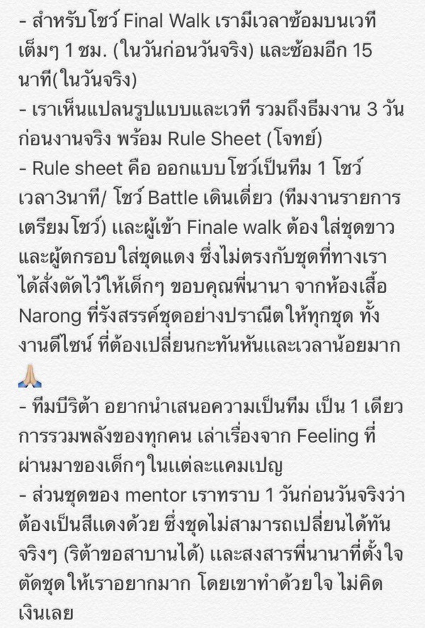 ล่าสุด (14 พฤษภาคม 2561) เมนเทอร์ริต้า ก็ขอเคลียร์ถึงเรื่องนี้ โดยอธิบายว่า มีเวลาซ้อมบนเวที Final Walk แค่ 1 ชั่วโมง และวันจริงอีก 15 นาที เห็นแปลนเวที ธีมงาน และ Rule Sheet โจทย์ 3 วันก่อนวันจริง ผู้เข้า Final Walk ต้องใส่ชุดขาว คนตกรอบชุดสีแดง ซึ่งไม่ตรงกับที่ทางเราได้สั่งตัดไว้ แต่ก็ได้มีการเปลี่ยนกะทันหัน ซึ่งทีมบีริต้าอยากนำเสนอความเป็นหนึ่งเดียวกัน ส่วนชุดของเมนเทอร์เพิ่งทราบ 1 วันก่อนวันจริงว่าต้องเป็นสีแดง จึงไม่สามารถเปลี่ยนได้ทัน