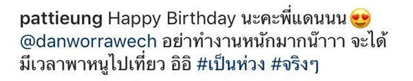 แต่งานนี้ไม่ได้มีแค่ภาพคู่เท่านั้น เพราะยังมีข้อความหวาน ๆ ที่กลั่นออกมาจากใจ แถมมีความอ้อนฝ่ายชายเล็ก ๆ ด้วยว่า "Happy Birthday นะคะพี่แดนนน @danworrawech อย่าทำงานหนักมากน๊าาา จะได้มีเวลาพาหนูไปเที่ยว อิอิ #เป็นห่วง #จริงๆ"