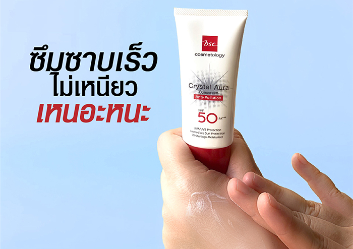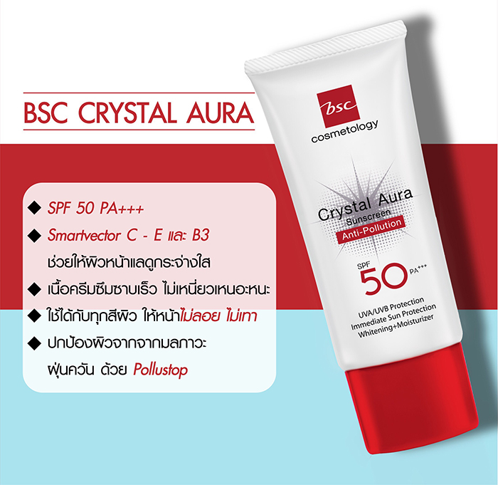 งานนี้กล้าพูดเลยว่า... โดนใจอย่างแรง ครีมแพง ๆ ยังต้องยอมสยบให้กับความเทพของครีมกันแดด BSC Crystal Aura Sunscreen SPF50 PA+++ Anti-Pollution ที่เป็นทั้งครีมกันแดด ครีมบำรุงผิว และช่วยปกป้องมลภาวะในตัว สวยครบจบในหลอดเดียวแบบนี้ ไม่ต้องไปมองหาครีมกันแดดตัวไหนให้วุ่นวายกันอีกต่อไปแล้ว ><