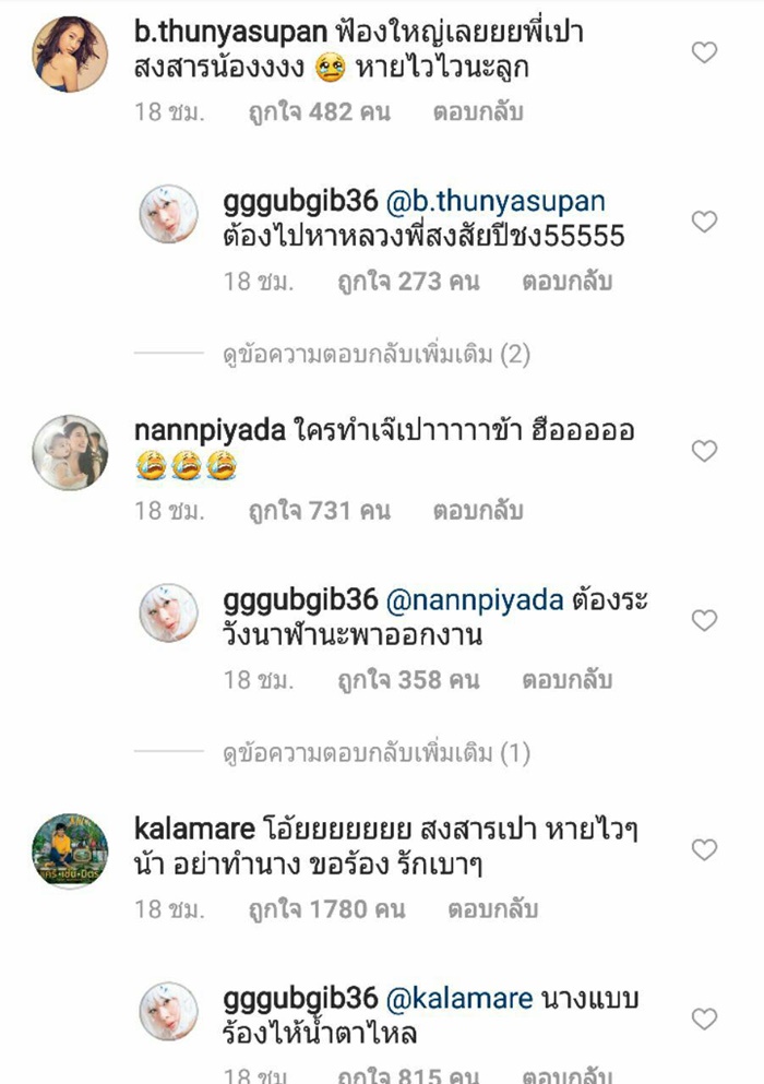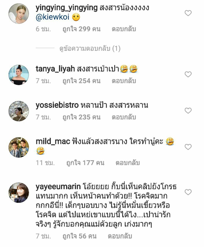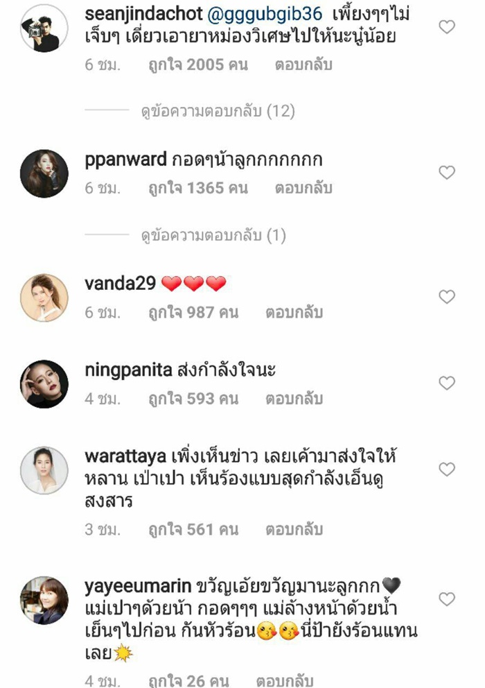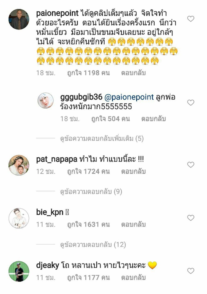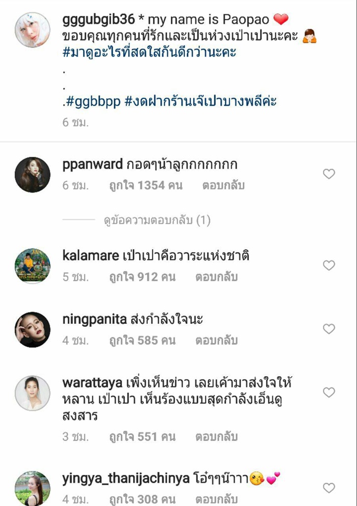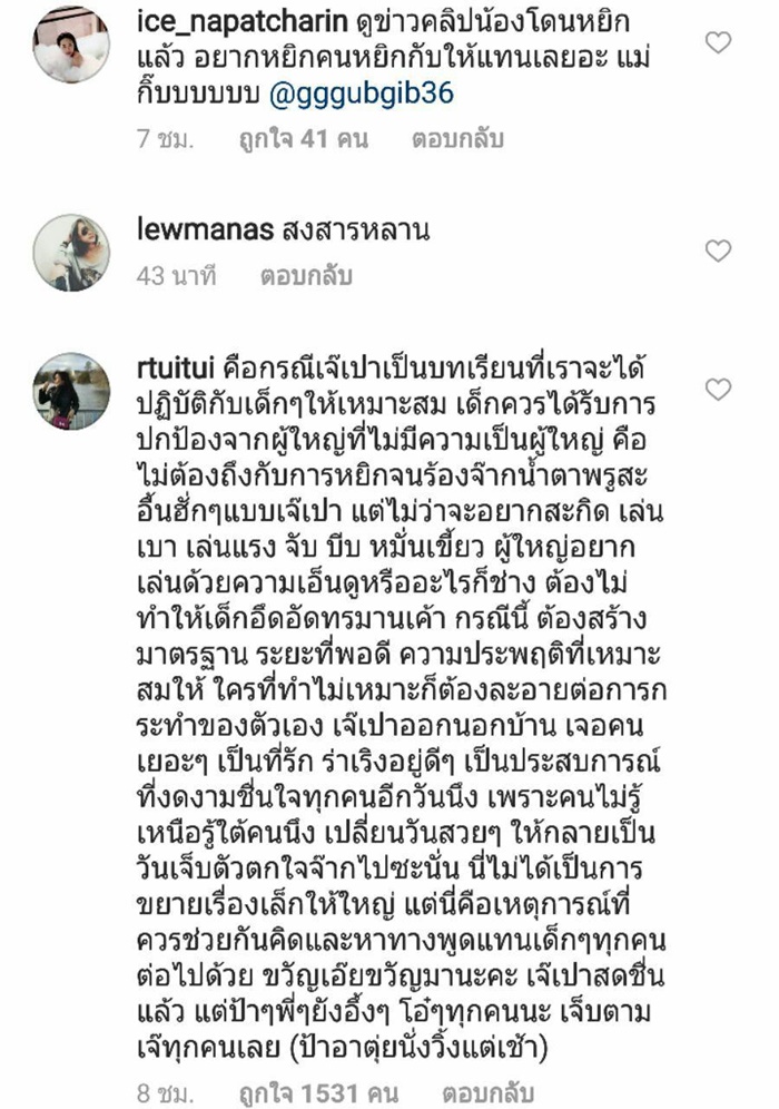 โดยคอมเมนต์จากเหล่าดารา และแฟน ๆ ต่างก็สงสาร เห็นใจ เอ็นดู น้องเป่าเปา ขณะที่หลายคนก็โมโหแทน อยากเจอตัวคนที่ทำแบบนี้กับน้อง จะได้ไปจัดการแทน บ้างก็แนะนำแม่กุ๊บกิ๊บว่าอย่ายอม ต้องเอาเรื่องคนทำให้ถึงที่สุด