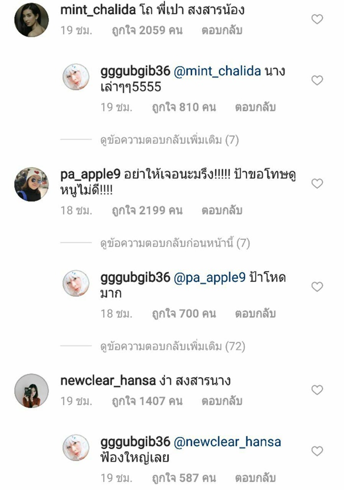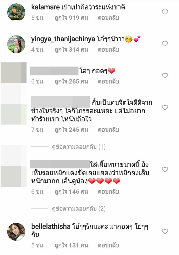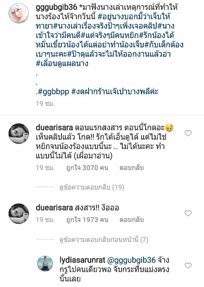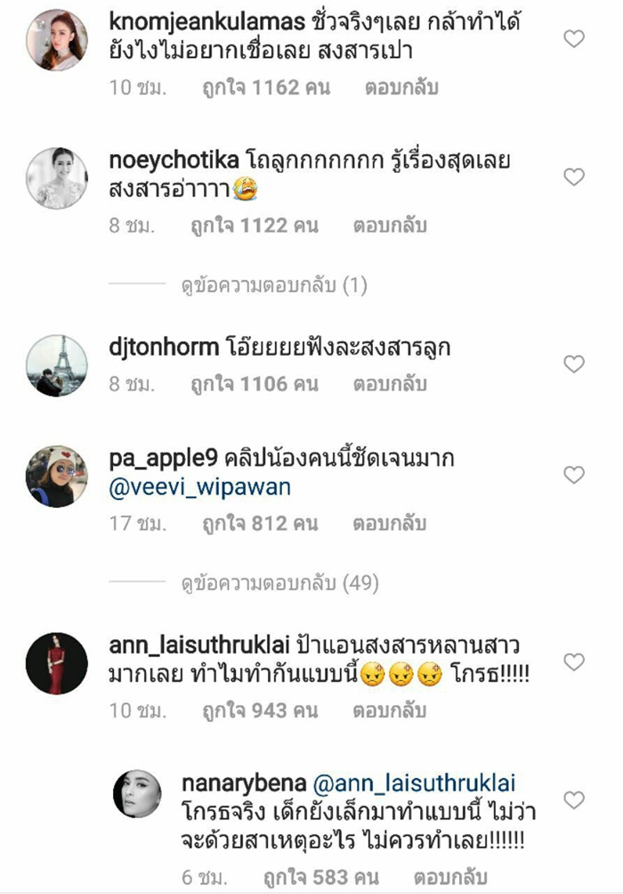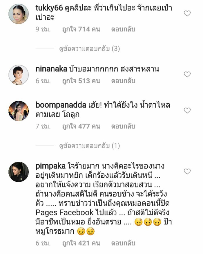 โดยคอมเมนต์จากเหล่าดารา และแฟน ๆ ต่างก็สงสาร เห็นใจ เอ็นดู น้องเป่าเปา ขณะที่หลายคนก็โมโหแทน อยากเจอตัวคนที่ทำแบบนี้กับน้อง จะได้ไปจัดการแทน บ้างก็แนะนำแม่กุ๊บกิ๊บว่าอย่ายอม ต้องเอาเรื่องคนทำให้ถึงที่สุด