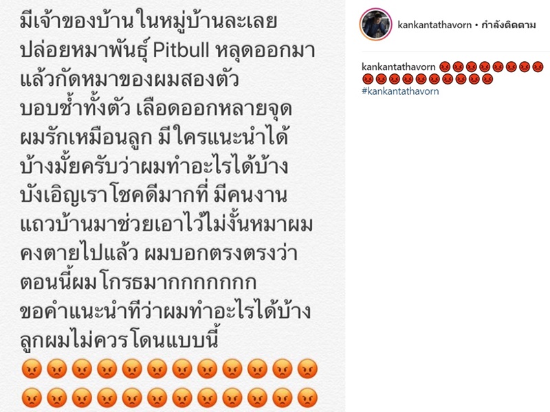 โดยหนุ่มกันต์ ระบุว่า มีเจ้าของบ้านในหมู่บ้านละเลยปล่อยหมาพันธุ์ Pitbull หลุดออกมาแล้วกัดหมาของผมสองตัวบอบช้ำทั้งตัว เลือดออกหลายจุด ผมรักเหมือนลูก มีใครแนะนำได้บ้างมั้ยครับว่าผมทำอะไรได้บ้าง บังเอิญเราโชคดีมากที่มีคนงานแถวบ้านมาช่วยเอาไว้ไม่งั้นหมาผมคงตายไปแล้ว ผมบอกตรง ๆ ว่าตอนนี้ผมโกรธมาก ขอคำแนะนำทีว่าผมทำอะไรได้บ้าง ลูกผมไม่ควรโดนแบบนี้