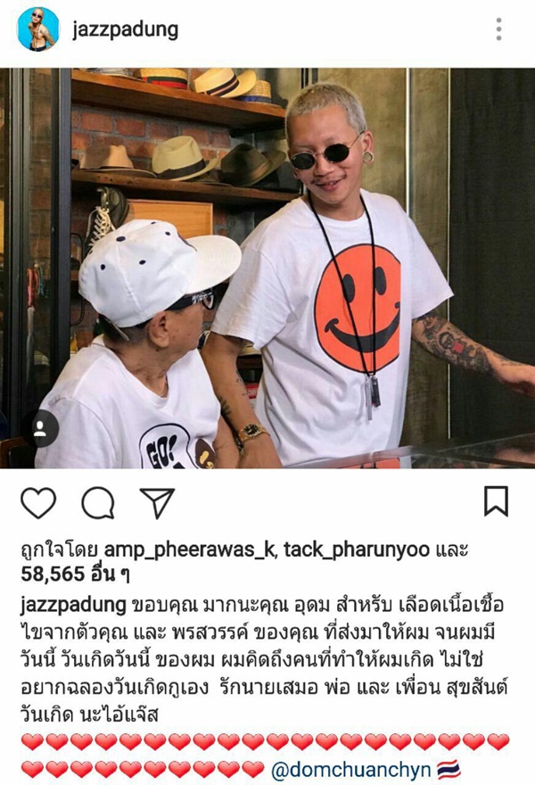"ขอบคุณมากนะคุณอุดม สำหรับเลือดเนื้อเชื้อไขจากตัวคุณ และพรสวรรค์ของคุณ ที่ส่งมาให้ผม จนผมมีวันนี้ วันเกิดวันนี้ของผม ผมคิดถึงคนที่ทำให้ผมเกิด ไม่ใช่อยากฉลองวันเกิดกูเอง รักนายเสมอ พ่อ และ เพื่อน สุขสันต์วันเกิด นะไอ้แจ๊ส"