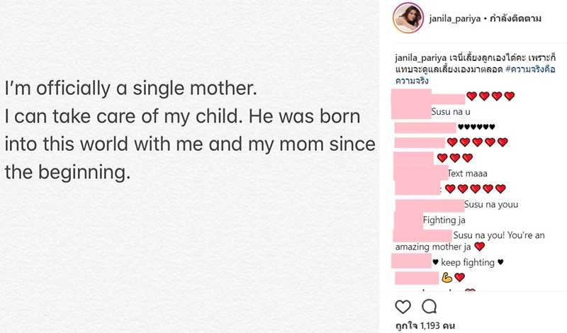 แต่ล่าสุด (30 พฤษภาคม 2561) ไม่รู้ว่าเกิดอะไรขึ้น เพราะจู่ ๆ สาวเจนี่ ก็โพสต์ข้อความประกาศตัวเป็นซิงเกิลมัม พร้อมบอกว่า "เจนี่เลี้ยงลูกเองได้ค่ะ เพราะก็แทบจะดูแลเลี้ยงเองมาตลอด #ความจริงคือความจริง"