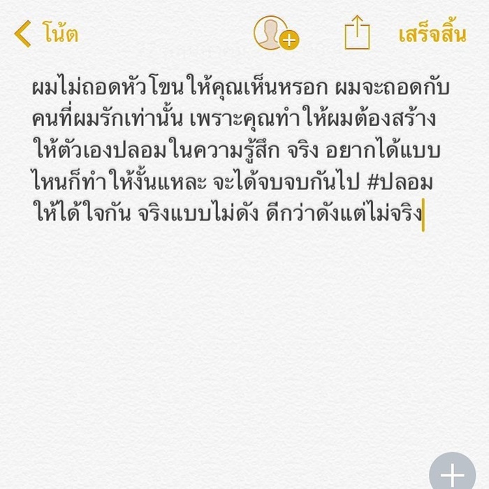 "ผมไม่ถอดหัวโขนให้คุณเห็นหรอก ผมจะถอดกับคนที่ผมรักเท่านั้น เพราะคุณทำให้ผมต้องสร้างให้ตัวเองปลอมในความรู้สึก จริง อยากได้แบบไหนก็ทำให้งั้นแหละ จะได้จบ ๆ กันไป #ปลอมให้ได้ใจกัน จริงแบบไม่ดัง ดีกว่าดังแต่ไม่จริง"