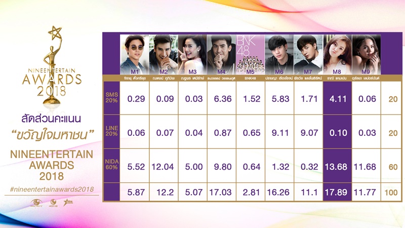 ไนน์เอ็นเตอร์เทน ก็ได้เผยคะแนนโหวต "ขวัญใจมหาชน" ให้ได้ดูกันแบบชัด ๆ