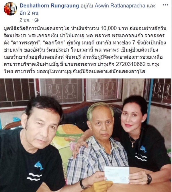 เพื่อนำไปเป็นค่าใช้จ่ายในการรักษาตัว โดยมอบเงินผ่านคุณอัศวิน รัตนประชา