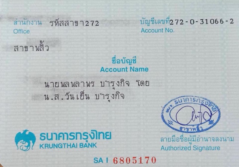 สามารถบริจาคเงินผ่านบัญชี นายพลพลาพร บำรุงกิจ โดย น.ส.วันเย็น บำรุงกิจ