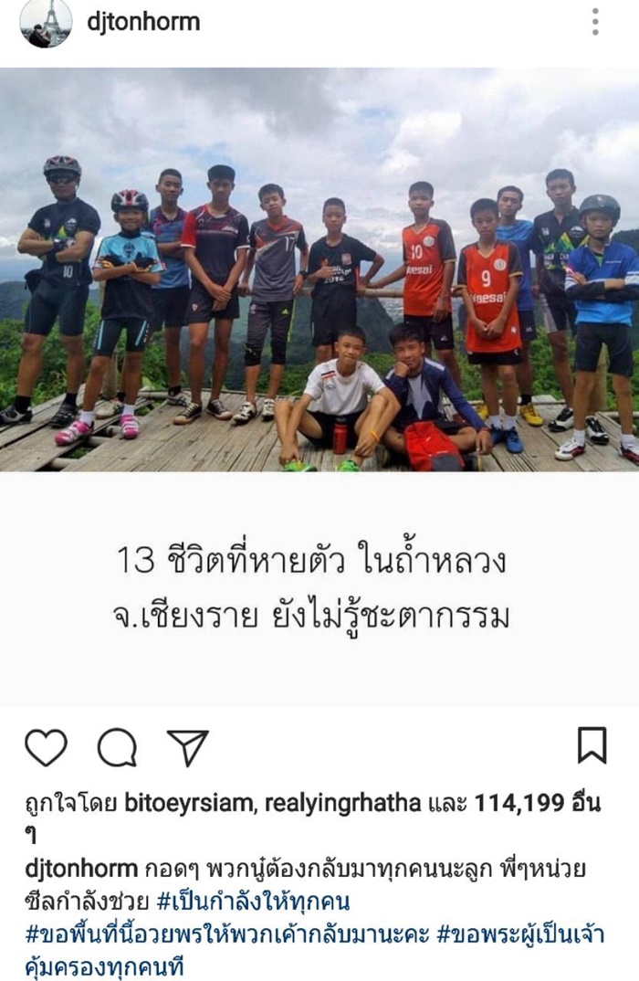 ล่าสุด (25 มิถุนายน 2561) ในทุกช่องทางโซเชียลมีเดียก็มีคนออกมาแสดงความคิดเห็นพร้อมทั้งให้กำลังใจผู้สูญหายและทีมค้นหาถึงเรื่องนี้ผ่านทาง #ถ้ำหลวง ส่งผลให้แฮชแท็กดังกล่าวติดเทรนด์ทวิตเตอร์อย่างรวดเร็ว รวมไปถึงคนบันเทิง อาทิ โอ๊ต ปราโมทย์, โอปอล์ ปาณิสรา, บุ๋ม ปนัดดา, กุ๊บกิ๊บ สุมณทิพย์, แก้ม วิชญาณี, ดีเจต้นหอม ศกุนตลา, เป้ย ปานวาด รวมไปถึง สาว ๆ จากวง BNK48 อย่าง มิวสิค, อร, น้ำหนึ่ง, ซัทจัง ฯลฯ ก็ได้ออกมาโพสต์ข้อความผ่านทั้งทางอินสตาแกรมและทวิตเตอร์เพื่อให้กำลังใจให้กับทั้ง 13 คน และทีมช่วยเหลือที่ต้องทำงานอย่างหนักด้วยเช่นกัน พร้อมอธิษฐานขอให้ทุกคนแคล้วคลาดปลอดภัย ตามหาผู้สูญหายเจอและพากลับออกมาได้อย่างปลอดภัยทุกคน