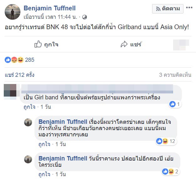 ถามถึงเรื่องดราม่าที่ เบน วงซิลลี่ ฟูลส์ (Silly Fools) โพสต์วิจารณ์ว่า "อยากรู้ว่าเทรนด์ BNK48 จะไปต่อได้สักกี่น้ำ Girlband แบบนี้ Asia Only !" เรารู้สึกอย่างไรบ้าง ?