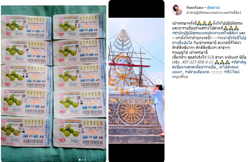 โดยสาวเฟี้ยว์ฟ้าว ได้เผยภาพลอตเตอรี่ถูกรางวัลเลขหน้า 3 ตัว 901 และ 429 รวมแล้ว จำนวน 10 ใบ ซึ่งเจ้าตัวเผยว่า ตั้งใจว่าถ้าถูกงวดนี้จะนำปัจจัยนี้ไปปูทางขึ้นบันได พระพุทธเจ้าทันใจองค์ที่ 109 ณ สำนักปฏิบัติธรรมเทพประทานพรโพธิสัตว์