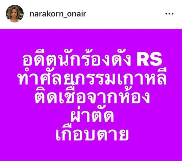 ต๊ะ นารากร ติยายน ผู้ประกาศข่าวชื่อดัง โพสต์ข้อความอดีตนักร้องดัง RS ทำศัลยกรรมเกาหลีติดเชื้อจากห้องผ่าตัดเกือบตาย