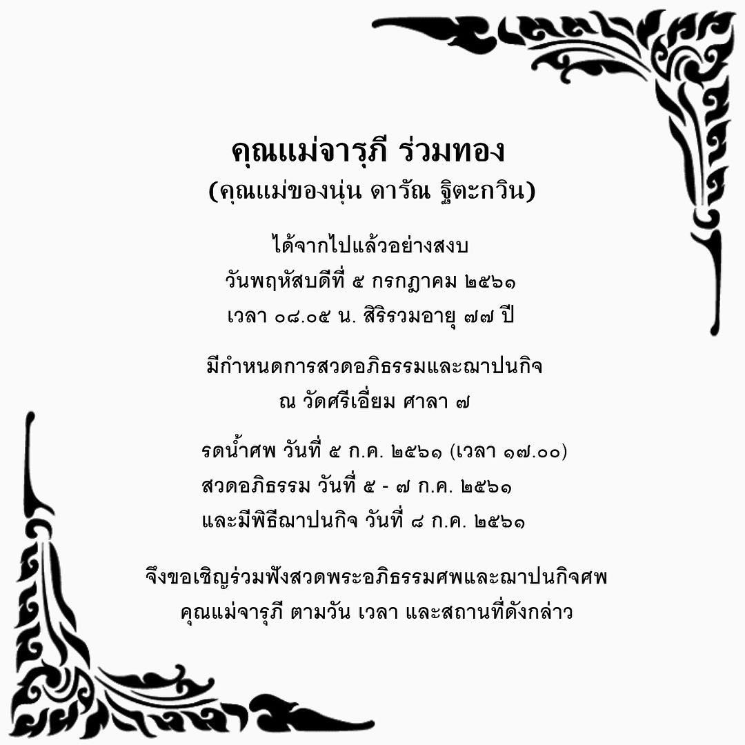 ขอแสดงความเสียใจกับนักแสดงรุ่นใหญ่ นุ่น ดารัณ และครอบครัว ที่ได้สูญเสีย คุณแม่จารุภี ร่วมทอง ซึ่งจากไปอย่างสงบในวัย 77 ปี เมื่อวันพฤหัสบดีที่ 5 กรกฎาคม 2561 เวลา 08.05 น.