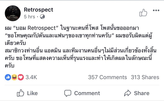 จนคดีพลิกขึ้นมาจริง ๆ ล่าสุด (21 กรกฎาคม 2561) ทางเพจ Retrospect ได้มีคำชี้แจงจาก บอม หนึ่งในสมาชิกของวง