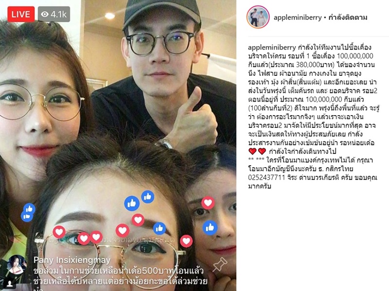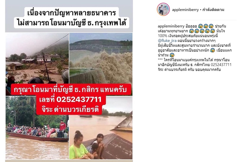 โดยสาวแอปเปิ้ล ระบุว่า "กำลังให้ทีมงานไปซื้อเครื่องบริจาคให้ครบ รอบที่ 1 ซื้อเครื่อง 100,000,000 กีบแล้ว (ประมาณ 380,000 บาท) ได้ของจำนวนหนึ่ง ไฟสาย ผ้าอนามัย กางเกงใน ยาจุดยุง รองเท้า มุ้ง ผ้าซิ่น (ซิ่นแต้ม) และอีกเยอะเลย นำส่งในวันพรุ่งนี้ เต็มคันรถ และยอดบริจาค รอบ 2 ตอนนี้อยู่ที่ประมาณ 100,000,000 กีบแล้ว (100 ล้านกีบที่ 2) ดีใจมาก พรุ่งนี้ถึงพื้นที่แล้ว จะรู้ว่าต้องการอะไรมากจริง ๆ แล้วเราจะเอาเงินบริจาครอบ 2 มาจัดให้มีประโยชน์มากที่สุด อาจจะเป็นเงินสดให้ทางผู้ประสบภัยเลย กำลังประสานงานกันอย่างเข้มข้นอยู่น้า รอหน่อยเด้อ กำลังใจกำลังเดินทางไป"