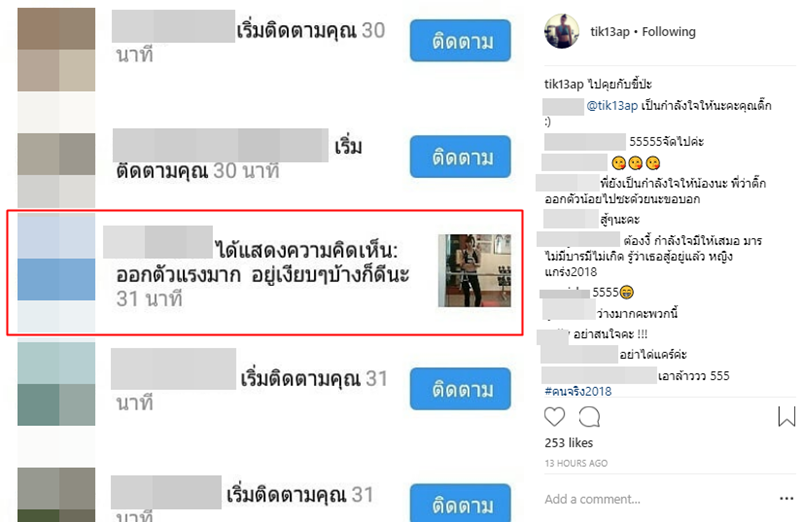โดยล่าสุด (29 กรกฎาคม 2561) ติ๊ก บิ๊กบราเธอร์ ก็ได้โพสต์ภาพคอมเมนต์จากคนที่เข้ามาป่วนใน IG ด่าเธอว่าออกตัวแรงมาก และคอมเมนต์ติติงต่าง ๆ พร้อมลงข้อความสวนกลับแบบชัด ๆ ว่า "ไปคุยกับขี้ป่ะ"