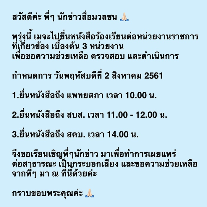 เธอจะเดินทางไปยื่นหนังสือร้องเรียนต่อหน่วยงานราชการที่เกี่ยวข้อง
