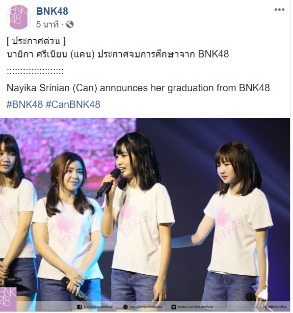 หลังจากในวันนี้ (5 สิงหาคม 2561) ทางเฟซบุ๊ก BNK48 ได้ออกมาแจ้งประกาศด่วนว่า แคนแคน