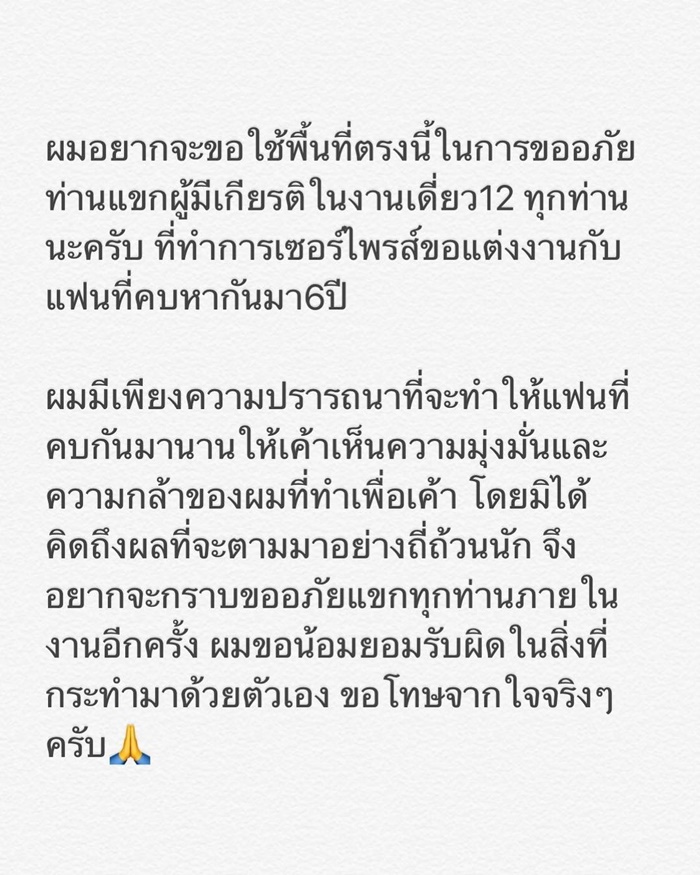 ผมมีเพียงความปรารถนาที่จะทำให้แฟนที่คบกันมานาน ให้เค้าเห็นความมุ่งมั่นและความกล้าของผมที่ทำเพื่อเค้า โดยมิได้คิดถึงผลที่จะตามมาอย่างถี่ถ้วนนัก จึงอยากจะกราบขออภัยแขกทุกท่านภายในงานอีกครั้ง ผมขอน้อมยอมรับผิดในสิ่งที่กระทำมาด้วยตัวเอง ขอโทษจากใจจริง ๆ ครับ"