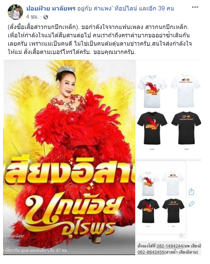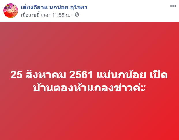 ศิลปินวงการลูกทุ่ง แห่โพสต์ส่งกำลังใจให้ นกน้อย อุไรพร เชื่อว่าแม่นกน้อยเป็นคนดี ด้านเฟซบุ๊กเสียงอิสาน ระบุแล้วว่า นกน้อย อุไรพร เตรียมแถลงข่าวข้อเท็จจริง ในวันที่ 25 สิงหาคม 2561