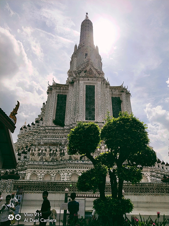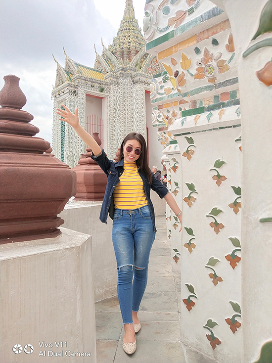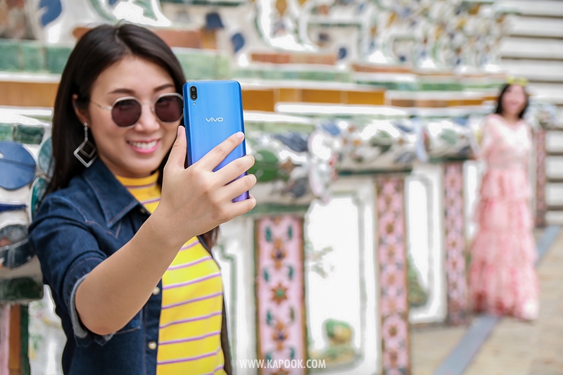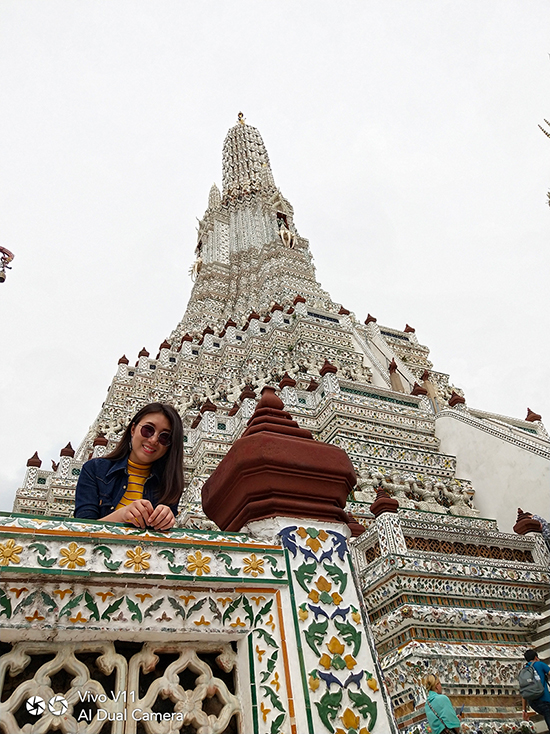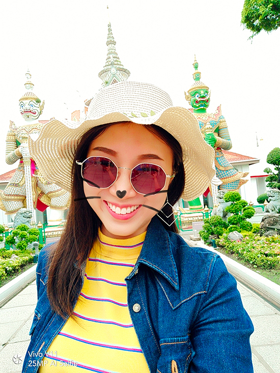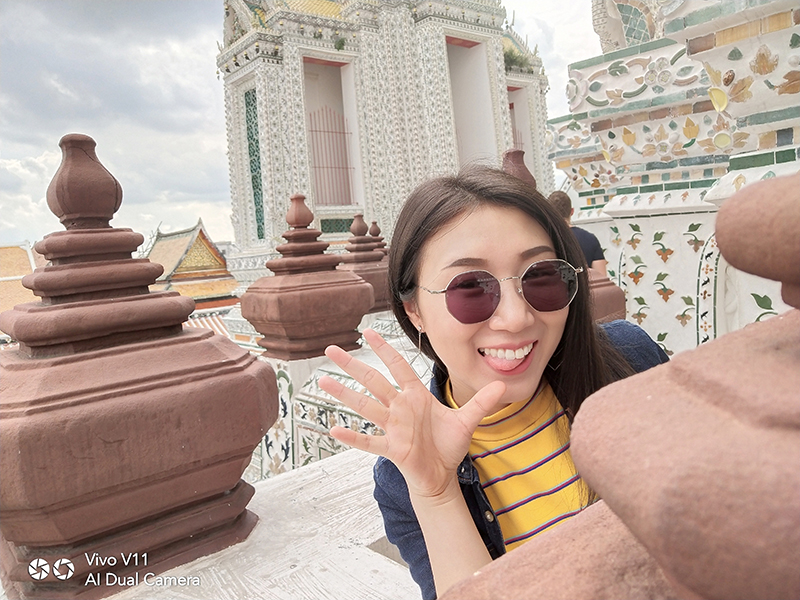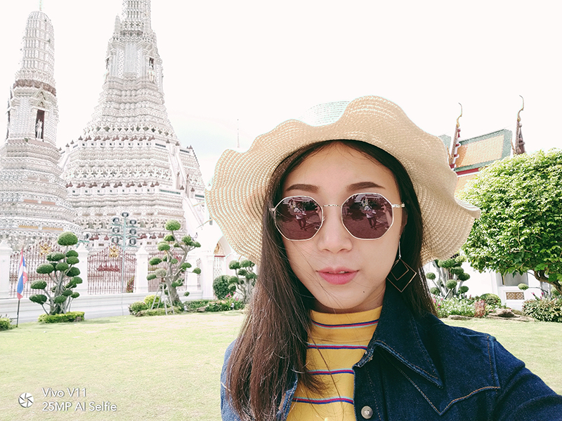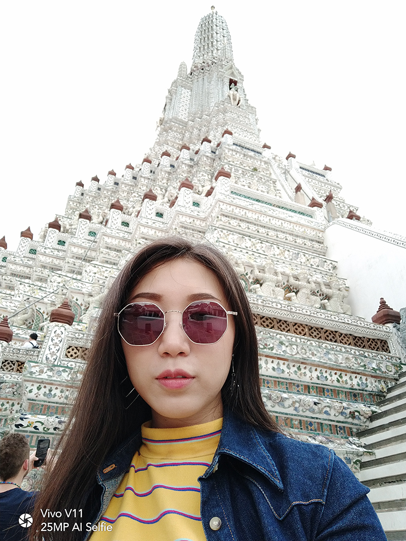 เมื่อเราเดินทางมาถึงวัดอรุณฯ วันนี้อากาศแจ่มใสเป็นใจให้เรามาถ่ายมาก ๆ แต่ถึงให้แสงน้อยแสงหมดยังไงเราก็ไม่กลัว ไหน ๆ ก็มาถึงแล้วคงต้องขอเซลฟี่กันสักหน่อย กล้องหน้าของ Vivo V11 เครื่องนี้ มีความละเอียดถึง 25 ล้านพิกเซล ! ห้ะ ! อะไรนะ ? ใช่แล้วค่ะ ไม่ได้เขียนผิดเลยสักนิด มาพร้อมเทคโนโลยี AI ที่ช่วยให้การเซลฟี่ของเราสวยใสคมชัดอย่างแน่นอน