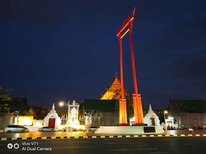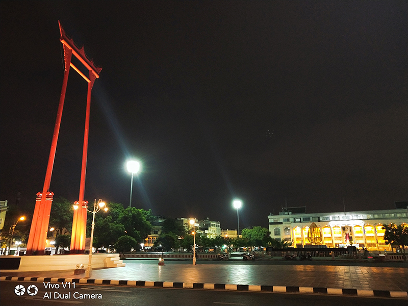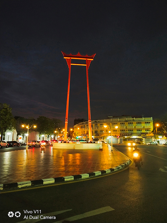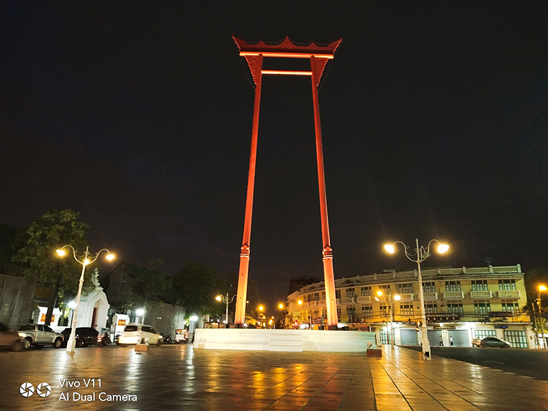 ข้ามถนนจากร้านกาแฟมาก็ถึงเสาชิงช้าแล้ว แสงกลางคืนแบบนี้ถ้ามีโหมด "AI Low Light HDR" ก็หายห่วง รูปสวยจริง ๆ