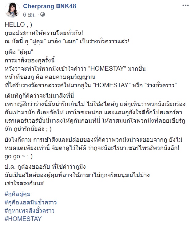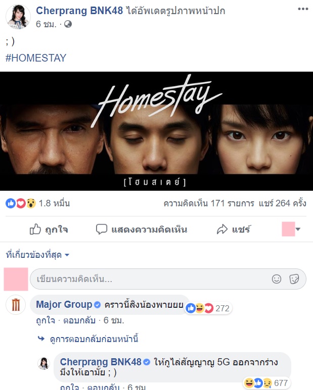 เมื่อผู้คุมจากภาพยนตร์ HOMESTAY บุกยึดเฟซบุ๊ก เฌอปราง BNK48 พร้อมตั้งสเตตัสแบบนี้ ทำเอาบรรดาโอตะตกใจอย่างแรง กัปตันเปลี่ยนไป