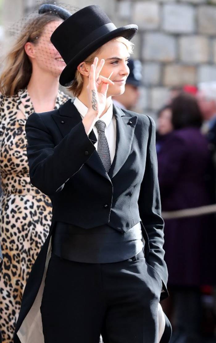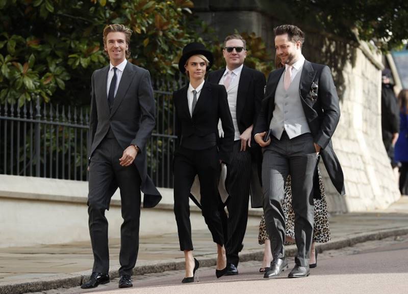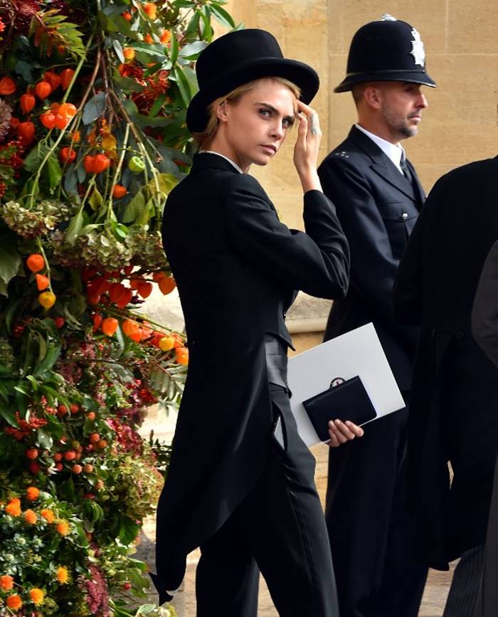 เดอเลวีญ (Cara Delevingne) ที่ได้มาเข้าร่วมในพิธีเสกสมรส ระหว่าง เจ้าหญิงยูจีนี แห่งยอร์ก กับพระคู่หมั้น แจ็ค บรูกส์แบงค์ ในลุคแปลกตา