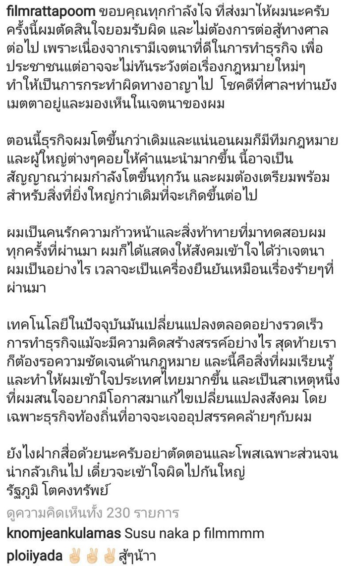 ก็ได้โพสต์ข้อความขอบคุณทุกกำลังใจ โดยระบุว่า "ขอบคุณทุกกำลังใจที่ส่งมาให้ผมนะครับ ครั้งนี้ผมตัดสินใจยอมรับผิด