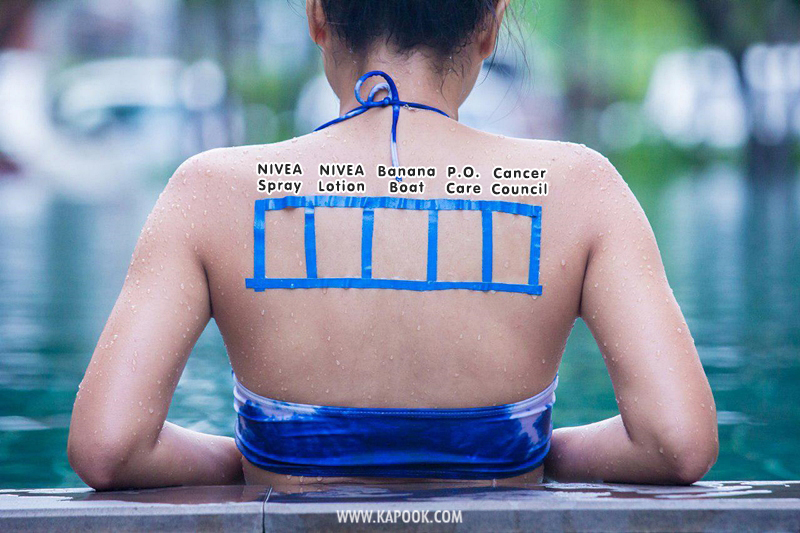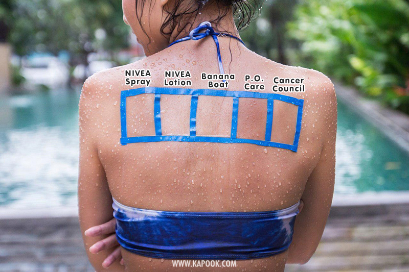 มาถึงด่านทดสอบคุณสมบัติหลักทั้งที เราก็ขอเล่นใหญ่โดยการใช้เทปแบ่งช่องทาครีมกันแดดไว้ที่แผ่นหลัง รอให้ซึมสู่ผิว 20 นาทีตามเวลาสามัญ เสร็จแล้วก็ลงสระไปว่ายน้ำขำ ๆ ก่อน จะได้ดูว่ามียี่ห้อไหนบ้างที่กันน้ำได้ดีบ้าง