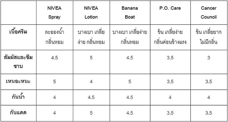 หลังฝ่าฟันผ่านมาแล้วครบทุกด่าน มาดูตารางสรุปคะแนนของครีมกันแดดทั้งหมดกันชัด ๆ เลยค่ะ