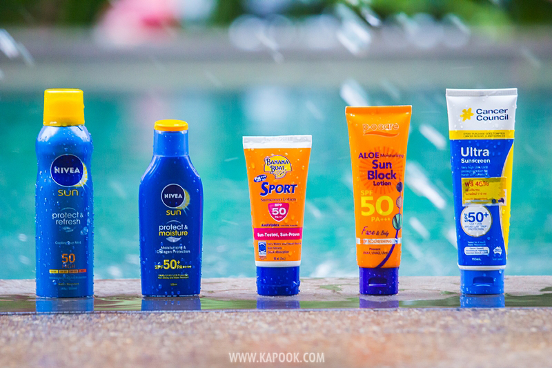 Banana Boat : ตัวนี้คือโอเคมากเรื่องกันน้ำ ไม่มีคราบน้ำเกาะ ไม่ทิ้งคราบขาว ตัวครีมยังเกาะผิวได้ดี ถูแล้วลื่น ๆ ผิว เอาไป 4.5/5 คะแนน