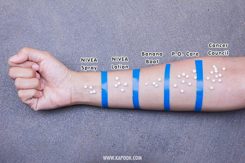 หลังจากทดสอบการซึมซาบตรงหลังมือเสร็จ ก็ผ่านไปแล้วประมาณ 15 นาที งั้นเรากลับมาดูครีมกันแดดที่เราทาทิ้งไว้ใต้ท้องแขนกันดีกว่าว่ามีใครแอบเยิ้ม แอบเหนอะเพิ่มขึ้นจากเดิมรึเปล่า โดยใช้วิธีโปรยเม็ดโฟมแล้วดูว่าตัวไหนจะมีเม็ดโฟมติดมากน้อยกว่ากัน