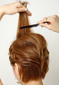 ขั้นตอนที่ 2 ยีผมด้านหลังให้พองตามรูป อาจใช้สเปรย์ฉีดผมก่อน เพื่อให้ผมที่ยีอยู่ทรง