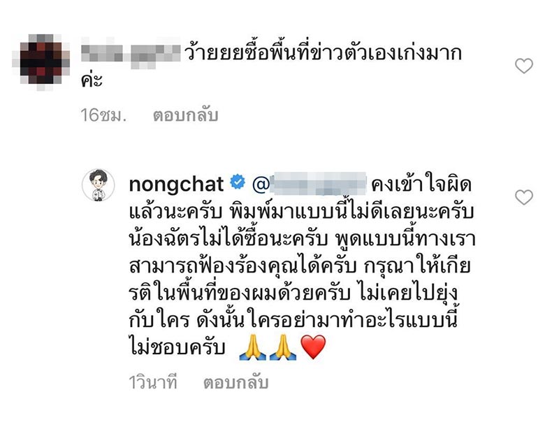 ล่าสุด (23 มกราคม 2562) น้องฉัตร ก็ได้แคปภาพหน้าจอของคนหนึ่งที่เข้ามาบอกว่า "ว้าย ซื้อพื้นที่ข่าวเก่งมากค่ะ" โดยที่น้องฉัตรได้ตอบไปว่า เรื่องนี้คงเป็นการเข้าใจผิด ตนไม่ได้ซื้อพื้นที่ข่าว และตนสามารถฟ้องร้องได้เลย กรุณาให้เกียรติตนด้วย ตนไม่เคยยุ่งกับใคร ดังนั้นอย่ามาทำอะไรแบบนี้ ตนไม่ชอบ