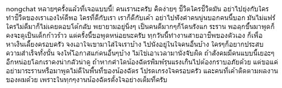 นอกจากนี้ น้องฉัตร ยังบอกอีกว่า คนเราอย่าไปยุ่งกับใคร ทำชีวิตตัวเองให้ดีก็พอ ใครที่ไม่ดีมาก็พยายามอยู่นิ่ง ๆ แต่พอลุกขึ้นมาพูดก็ดูเป็นเด็กก้าวร้าว ซึ่งครั้งนี้ ตนขอพูดหน่อยว่า ตนทำงานหาเลี้ยงครอบครัว ให้โอกาสคนอื่นบ้าง เอาใจเขามาใส่ใจเรา ไม่ใช่มานั่งจับผิด ถ้ามีคนแบบนี้อยู่บนโลกเยอะ ๆ อีกหน่อยโลกคงน่ากลัว