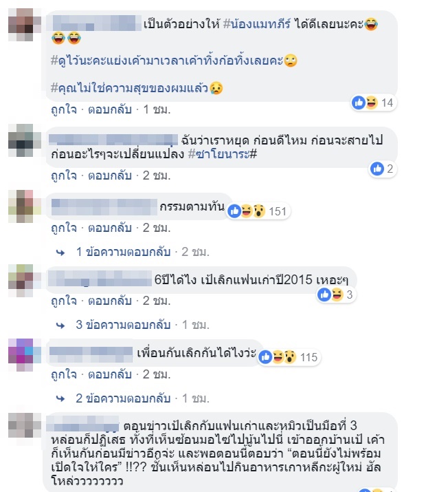ซึ่งภายหลังจากที่มีการเปิดเผยเรื่องเลิกกันครั้งนี้ ทำเอาชาวโซเชียลออกอาการงงกันยกใหญ่ เพราะว่าไม่รู้ว่าทั้งคู่ไปคบกันตอนไหน แถมฝ่ายหญิงบอกว่า รู้จักกันมา 6 ปีแล้วด้วย เนื่องจากช่วงที่มีเรื่องฝ่ายชายก็ยืนยันว่าเป็นแค่เพื่อนกันเท่านั้นไม่มีอะไร งานนี้เลยคอมเมนต์กันสนั่นว่า ไหนบอกเป็นเพื่อนกัน กรรมยุติธรรมเสมอ เป็นข่าวที่อ่านแล้วยิ้มมุมปาก