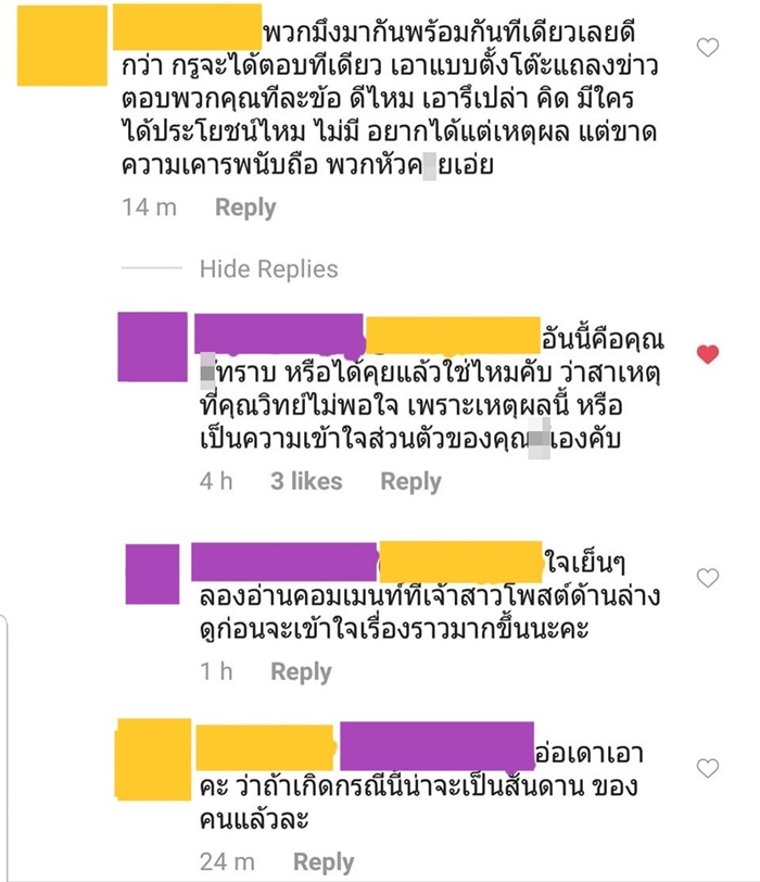 งานนี้กลับดราม่าเข้าไปอีก เมื่อนักร้องหญิงรุ่นใหญ่ เข้ามาคอมเมนต์ดุเดือดว่า "พวกมึงมากันพร้อมกันทีเดียวเลยดีกว่า กรูจะได้ตอบทีเดียวเอาแบบตั้งโต๊ะแถลงข่าวตอบพวกคุณทีละข้อดีไหม เอารึเปล่า คิด มีใครได้ประโยชน์ไหม ไม่มี อยากได้แต่เหตุผล แต่ขาดความเคารพนับถือ พวกหัว_วยเอ๊ย" เมื่อมีคนเข้าไปบอกว่าให้อ่านที่เจ้าสาวชี้แจงก่อนจะได้เข้าใจมากขึ้น และตกใจที่เห็นใช้ภาษาแบบนี้ เจ้าตัวก็ตอบว่า "ด่ากันไม่ต้องใช้ภาษาดีมากหรอก หรือกรูต้องใช้คำราชาศัพท์กับพวกมึง"
