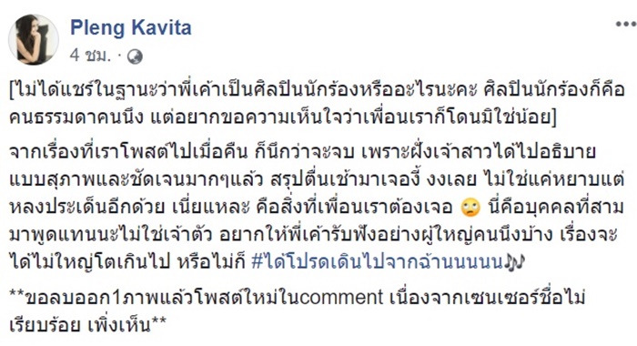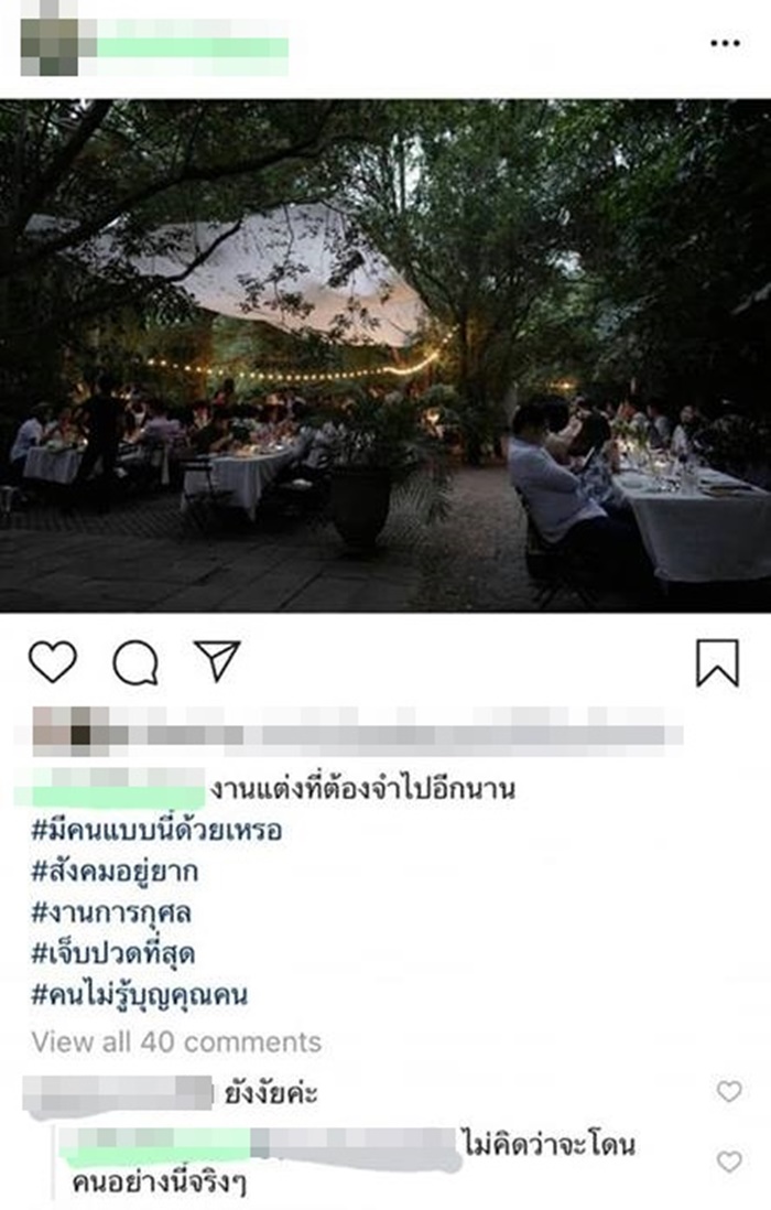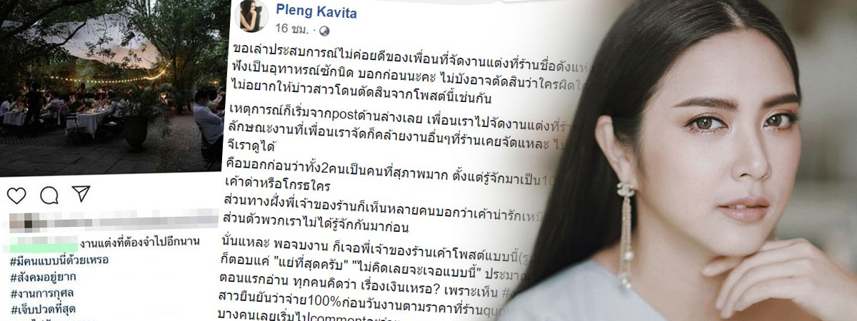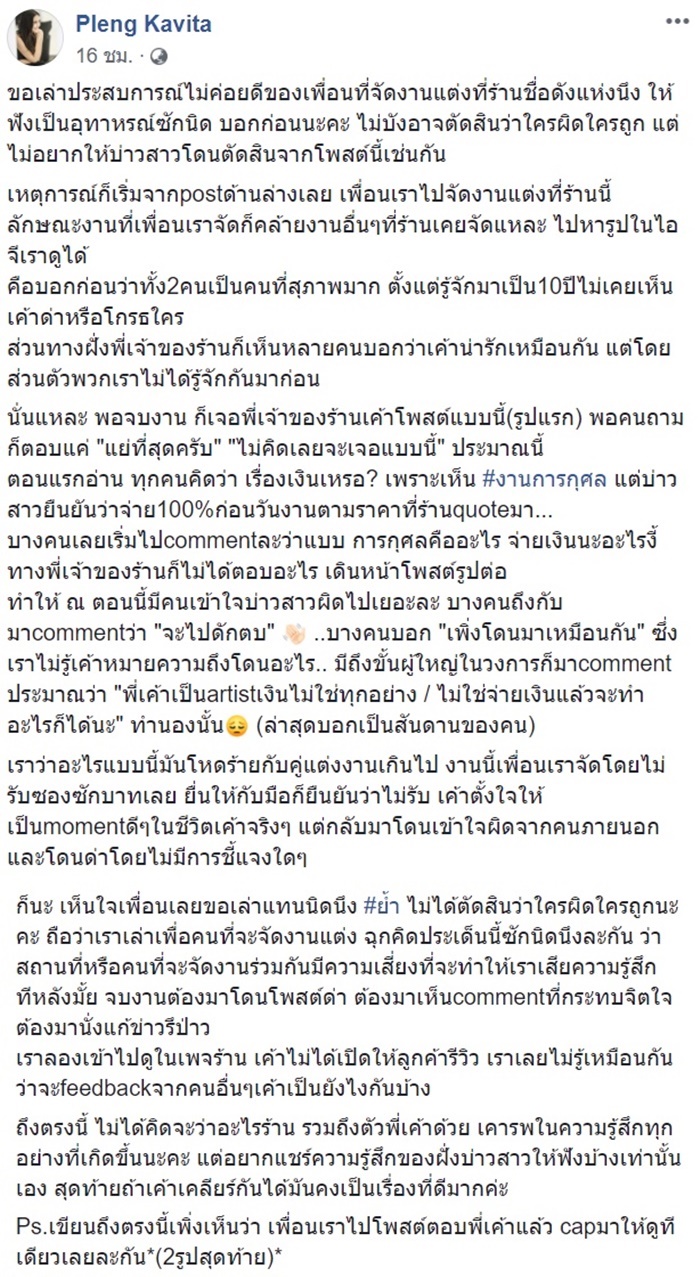 งานนี้เพื่อนเราจัดโดยไม่รับซองสักบาทเลย เค้าตั้งใจให้เป็นโมเมนต์ดี ๆ ในชีวิตเค้า แต่กลับมาโดนเข้าใจผิดจากคนภายนอก และโดนด่าโดยไม่มีการชี้แจงใด ๆ ถึงตรงนี้ไม่ได้คิดจะว่าอะไรร้าน รวมถึงตัวพี่เค้าด้วย เคารพในความรู้สึกทุกอย่างที่เกิดขึ้นนะคะ แต่อยากแชร์ความรู้สึกของฝั่งบ่าวสาวให้ฟังบ้างเท่านั้นเอง สุดท้ายถ้าเค้าเคลียร์กันได้มันคงเป็นเรื่องที่ดีมากค่ะ"
