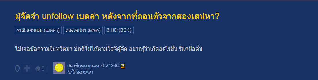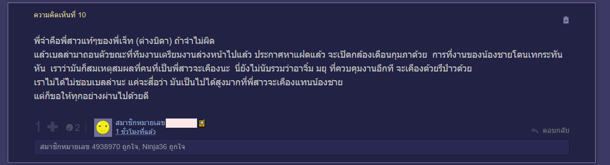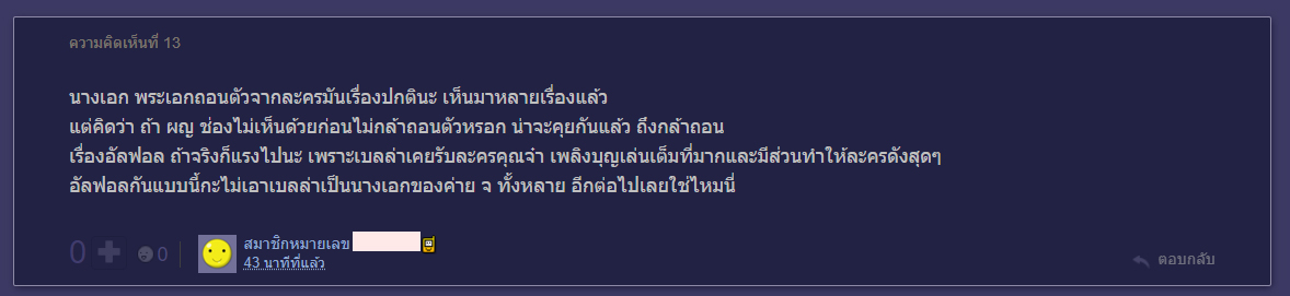 นอกจากนี้ ยังมีการตั้งกระทู้เกี่ยวกับเรื่องดังกล่าวลงในพันทิป ซึ่งชาวเน็ตหลายคนมองว่า คุณจ๋า อาจจะไม่พอใจสาวเบลล่าหรือไม่ ? ที่ถอนตัวจากละครน้องชาย ทั้งที่เพิ่งมีการประกาศตามหาตัวนักแสดงมาเป็นคู่ฝาแฝด มีการเตรียมงานทุกอย่างไว้หมดแล้ว อีกทั้งละครกำลังจะเปิดกล้องในเดือนกุมภาพันธ์นี้แล้วด้วย ซึ่งการที่งานน้องชายโดนเทกะทันหันก็อาจเป็นเหตุผลทำให้เคืองได้