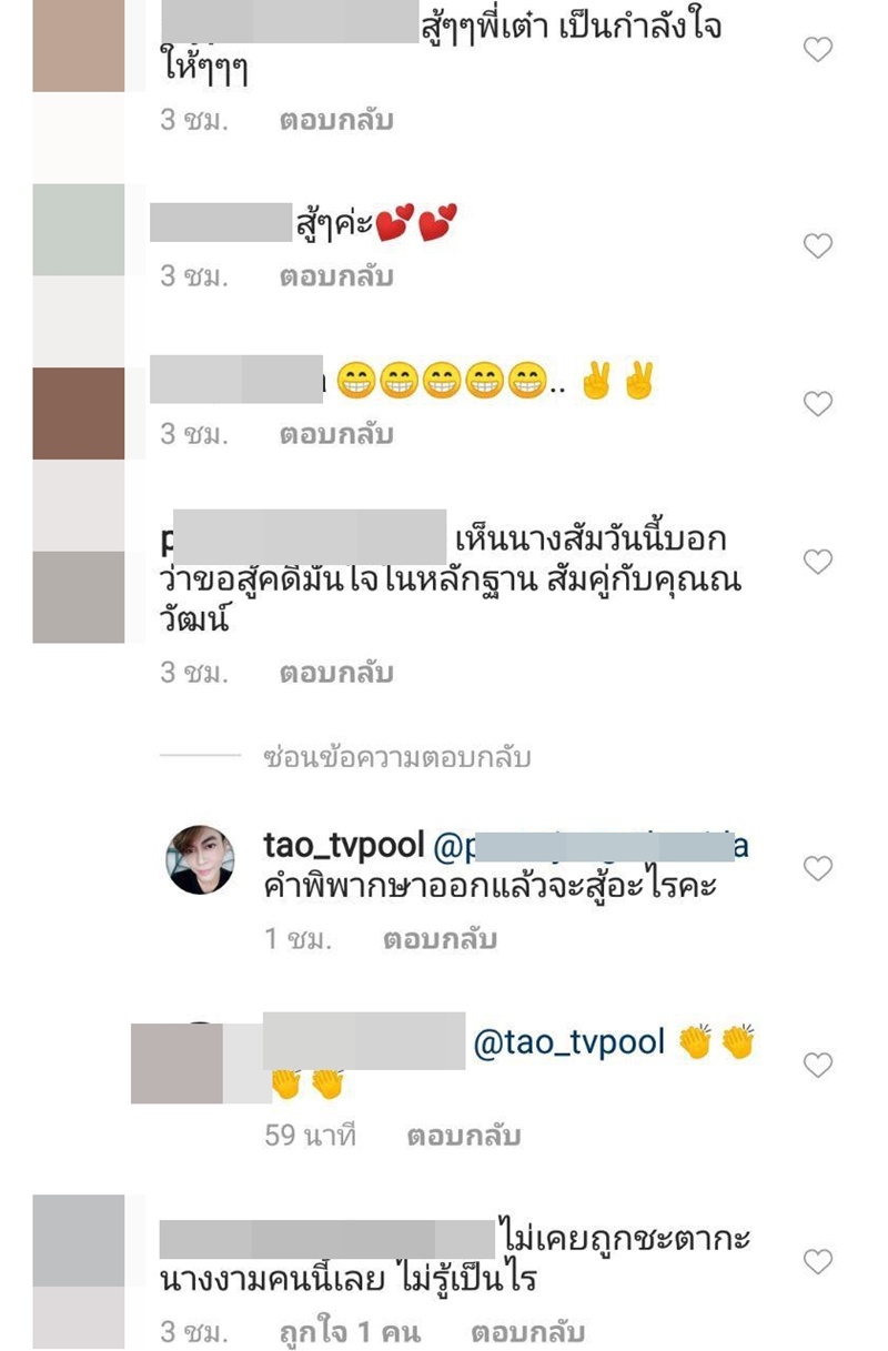 ขณะเดียวกันก็มีคนเข้ามาคอมเมนต์บอกว่า "เห็นนางสัมฯ วันนี้บอกว่าขอสู้คดีมั่นใจในหลักฐาน สัมฯ คู่กับคุณณวัฒน์" เต๋า ทีวีพูล จึงได้ตอบกลับไปว่า "คำพิพากษาออกแล้วจะสู้อะไรคะ"
