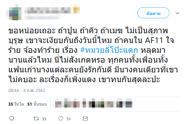 โซเชียลปกป้อง คิว-ปูน AF11 หลังออกมาแฉ หมวยลี่ ชี้ไม่ใช่หมาหมู่ แต่แค่อยากให้อีกฝ่ายหยุดทำร้ายคนอื่นเหมือนที่แล้ว ๆ มา เตือนระวังเจอฟ้อง